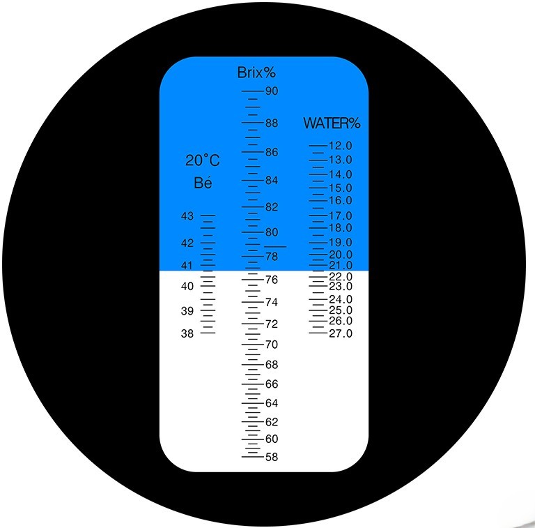 There are many types of refractometers to measure liquids and the one we use has a range which is specifically for liquid honey (12-27% water). It has automatic temperature compensation (ATC) which allows readings to be taken between 10°C and 30°C without adjustment.